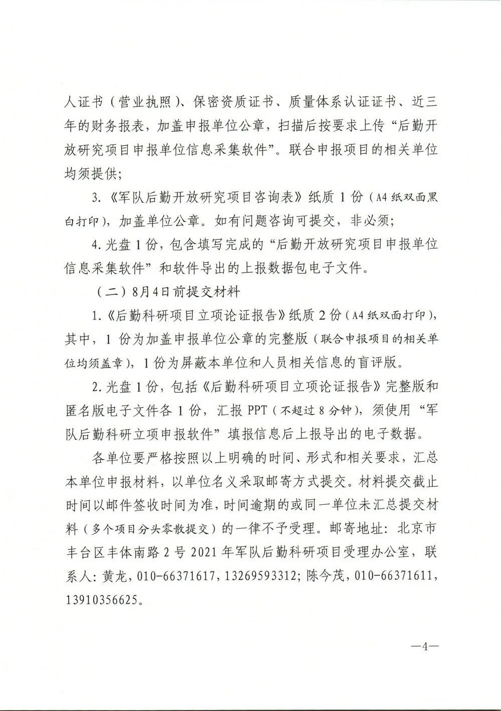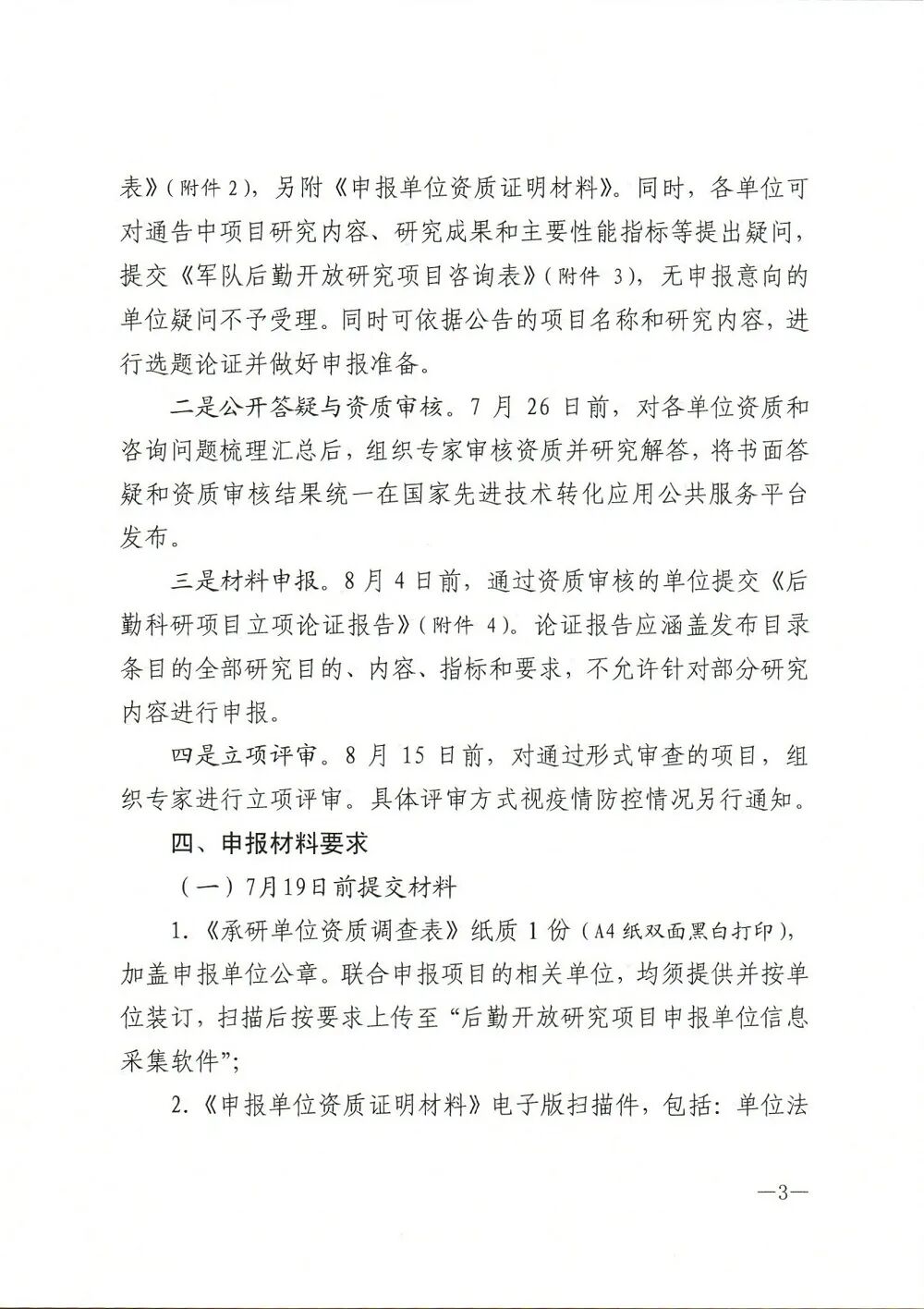 三是材料申报。8 月 4 日前,通过资质审核的单位提交 《 后勤科研项目立项论证报告 》 (附件 4 )。论证报告应涵盖发布目录条目的全部研究目的、内容、指标和要求,不允许针对部分研究内容进行申报.四是立项评审。8 月 15 日前,对通过形式审查的项目,组织专家进行立项评审。具体评审方式视疫情防控情况另行通知。