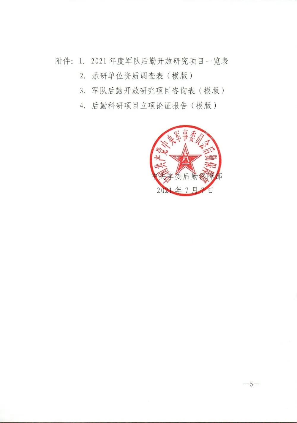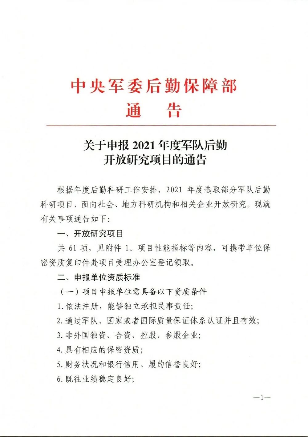 根据年度后勤科研工作安排, 2021 年度选取部分军队后勤科研项目,面向社会、地方科研机构和相关企业开放研究.现就有关事项通告如下:
