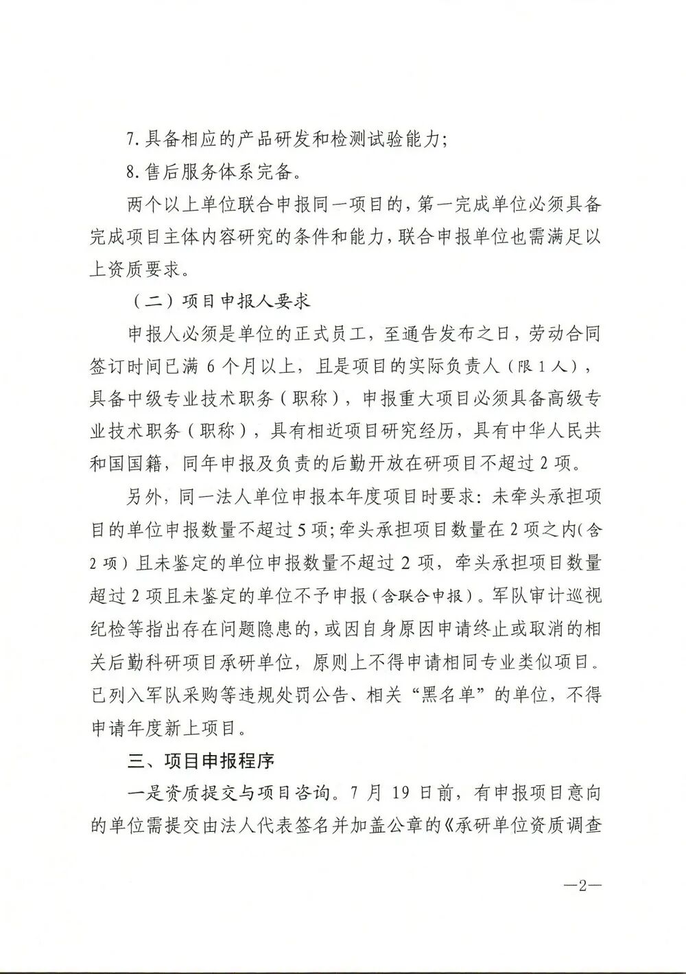 军委后勤保障部7月7日下发通告,面向社会、地方科研机构和企业开放申请军队后勤科研项目,共61项,涉及经费3.2亿元,7月19日前报告截止,资质要求不高,欢迎报告申请。附件下载请加微信:xiaoxiwl1或xiaoxiwl2。正文如下: